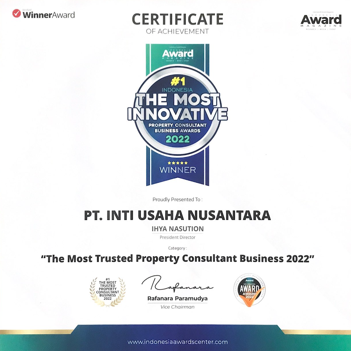 The Company's owner has tremendous previous experience while working in large companies. He first started his career in the retail world by developing The Body Shop Indonesia and became the best cosmetics company of its time. As Head of Development and Marketing at Agung Podomoro Land, he further honed his strengths in the commercial world. The massive development and construction at Transmart CT Corp is inseparable from his role as well. His success in expanding the business has become a benchmark of his knowledge throughout Indonesia. Currently he is focused on developing Inti Usaha Nusantara with the strength of his experience, insight and networking so far, assisted also by a reliable team in his field. Inti Usaha Nusantara continues to move forward and focus on the scope of Property, Retail and Service Management.